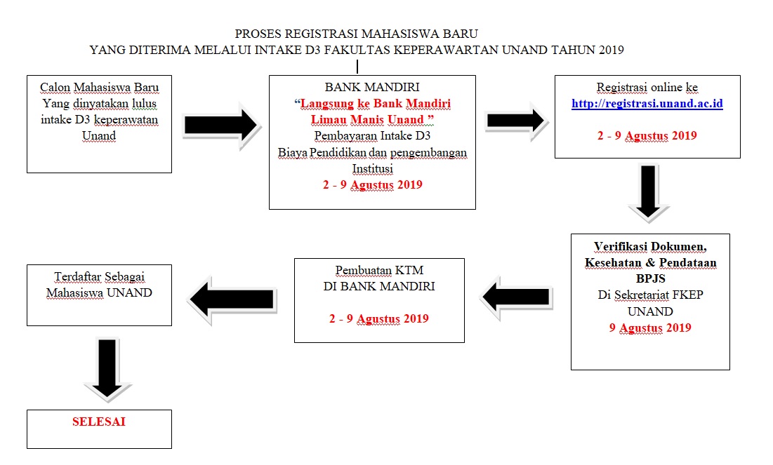 Untuk melakukan Registrasi pada program Intake D3 Fakultas Keperawata Universitas Andalas setelah dinyatakan diterima melalui program seleksi Intake D3 FKEP tahun 2019, dengan melalui tahapan sebagai berikut :