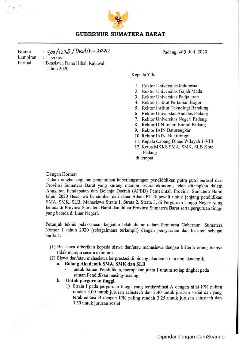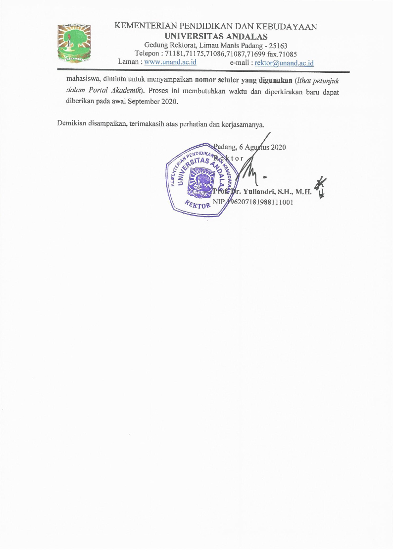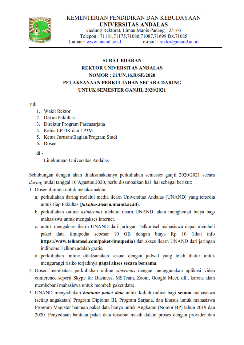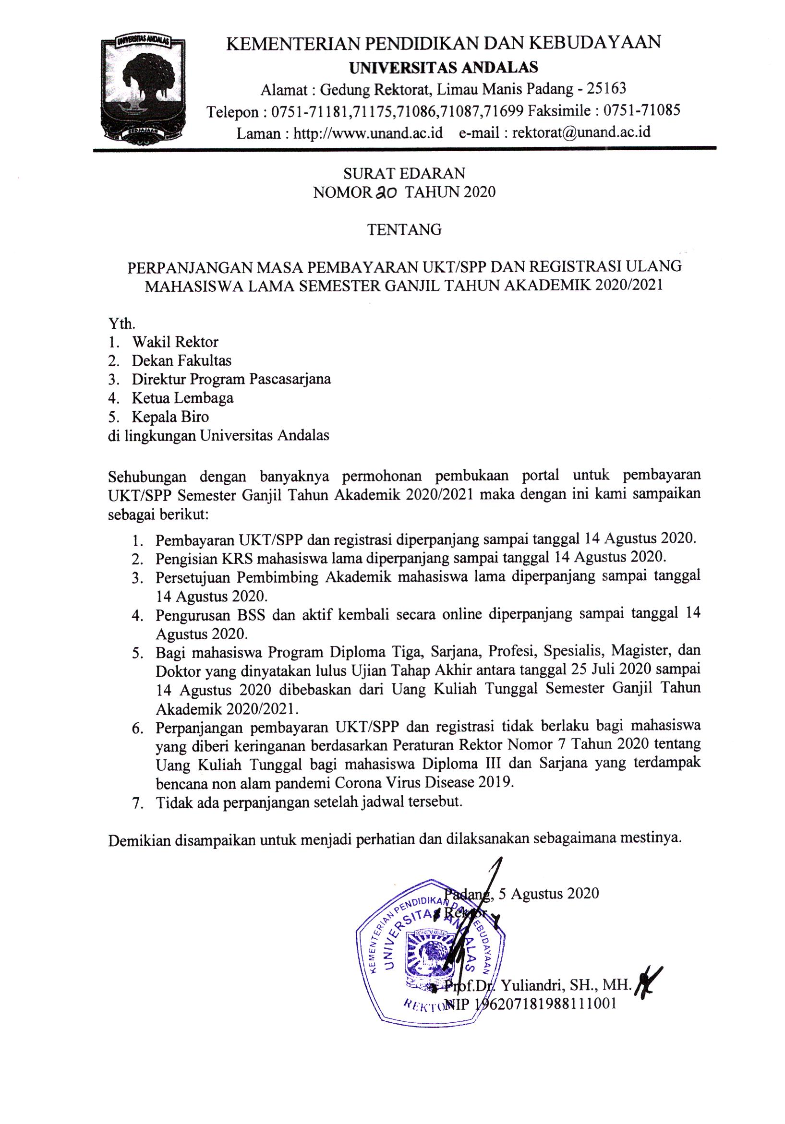 Rektor Unand mengucapkan selamat kepada adik-adik yang telah diterima melalui jalur seleksi SBMPTN 2020. Kelalaian dan kesalahan akibat tidak mengikuti mekanisme pendaftaran ulang yang telah ditentukan dapat mengakibatkan pembatalan kelulusan.