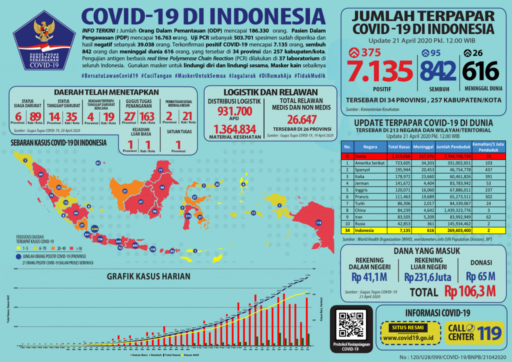 Kemudian untuk jumlah orang dalam pemantauan (ODP) menjadi 186.330 orang dan pasien dalam pengawasan (PDP) menjadi 16.763 orang. Data tersebut diambil dari 34 provinsi dan 257 kabupaten/kota di Tanah Air, yang mana angka tersebut sekaligus menunjukkan bahwa kasus COVID-19 semakin meluas dari hari sebelumnya.