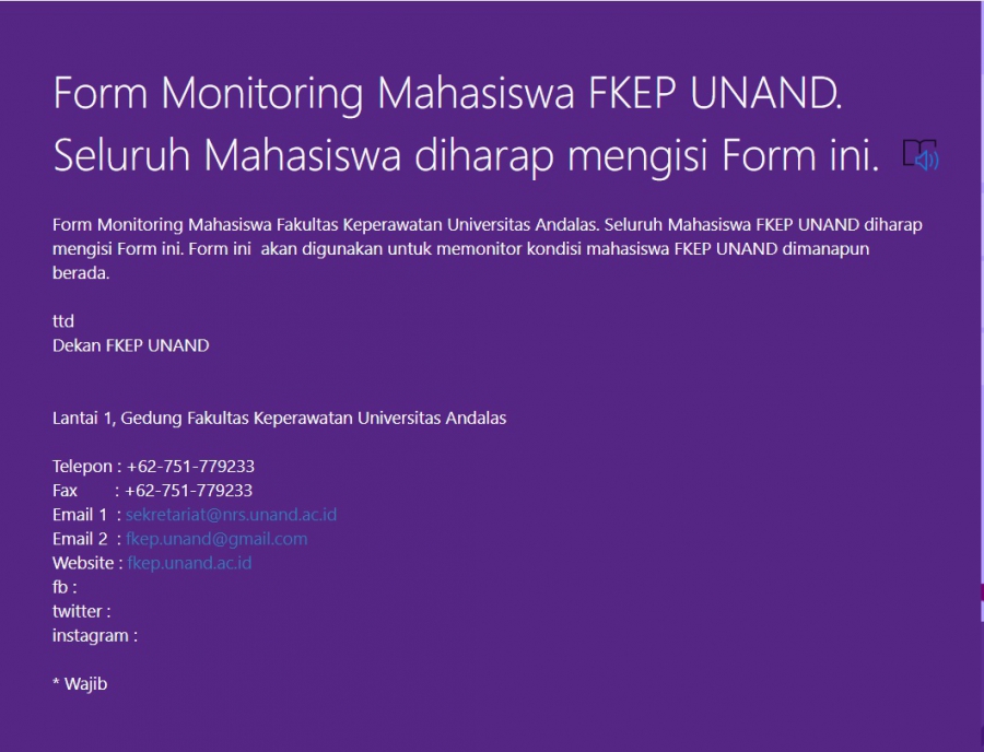 Form Monitoring Mahasiswa FKEP UNAND. Seluruh Mahasiswa diharap mengisi Form ini.