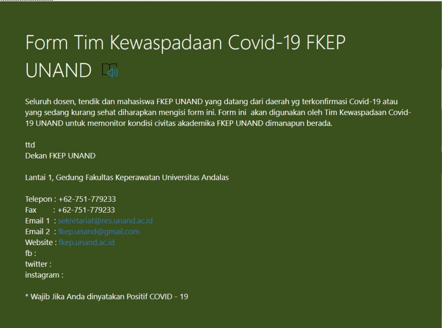 Form Tim Kewaspadaan Covid-19 FKEP UNAND * Jika Anda Terindikasi COVID 19