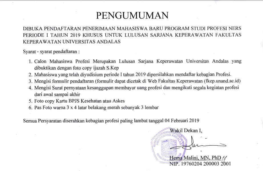 DIBUKA PENDAFTARAN PENERIMAAN MAHASISWA BARU PROGRAM STUDI PROFESI NERS PERIODE III TAHUN 2018 KHUSUS UNTUK LULUSAN SARJANA KEPERAWATAN FAKULTAS KEPERAWATAN UNIVERSITAS ANDALAS