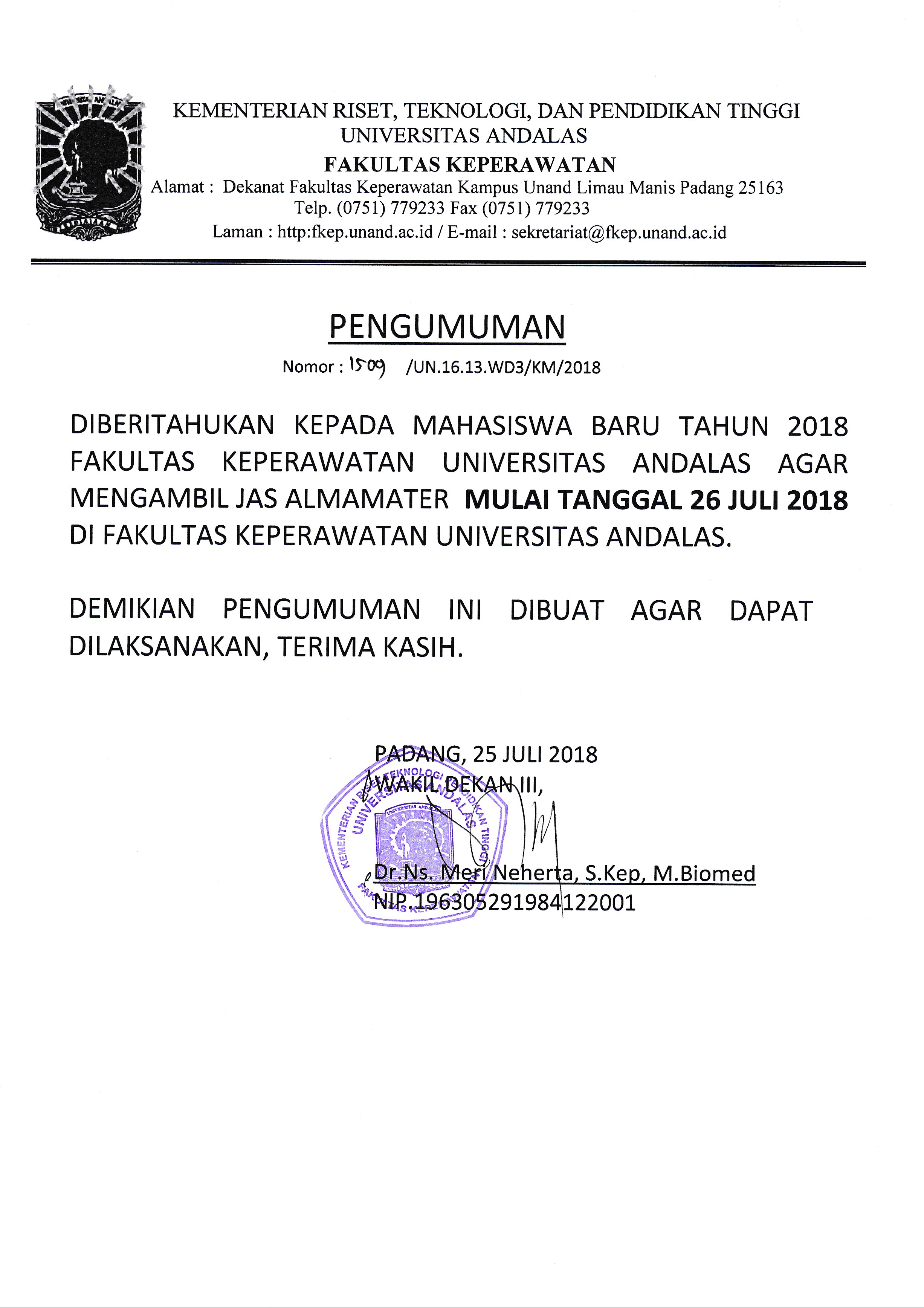 DIBERITAHUKAN KEPADA SELURUH MAHASIWA BARU S1 REGULER , S1 MANDIRI , INTAKE D3 TAHUN 2018 , FAKULTAS KEPERAWATAN UNIVERSITAS ANDALAS AGAR MENGIKUTI ORIENTASI PROSES BELAJAR MENGAJAR (OPBM) DI FAKULTAS KEPERAWATAN UNIVERSITAS ANDALAS PADA :