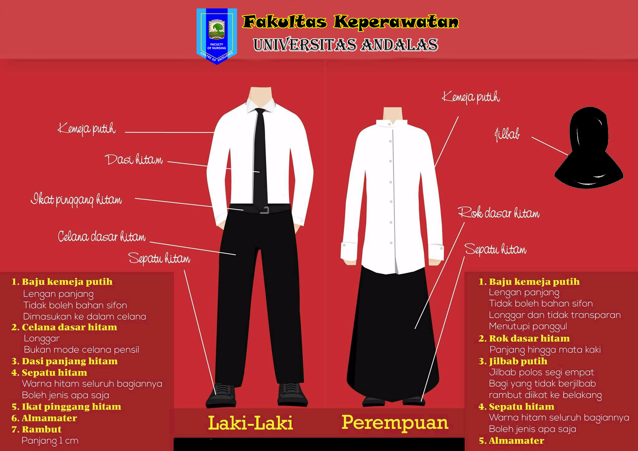 - Wanita : Kemeja putih lengan panjang menutup pantat, rok hitam panjang (model A dan tidak boleh span), memakai dalaman yang tidak mencolok, memakai legging min. sebetis, jilbab hitam polos dan menggunakan anak jilbab hitam polos, dan membawa almamater, serta tidak menggunakan make up selama kegiatan BAKTI berlangsung.